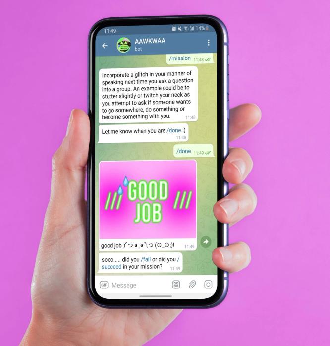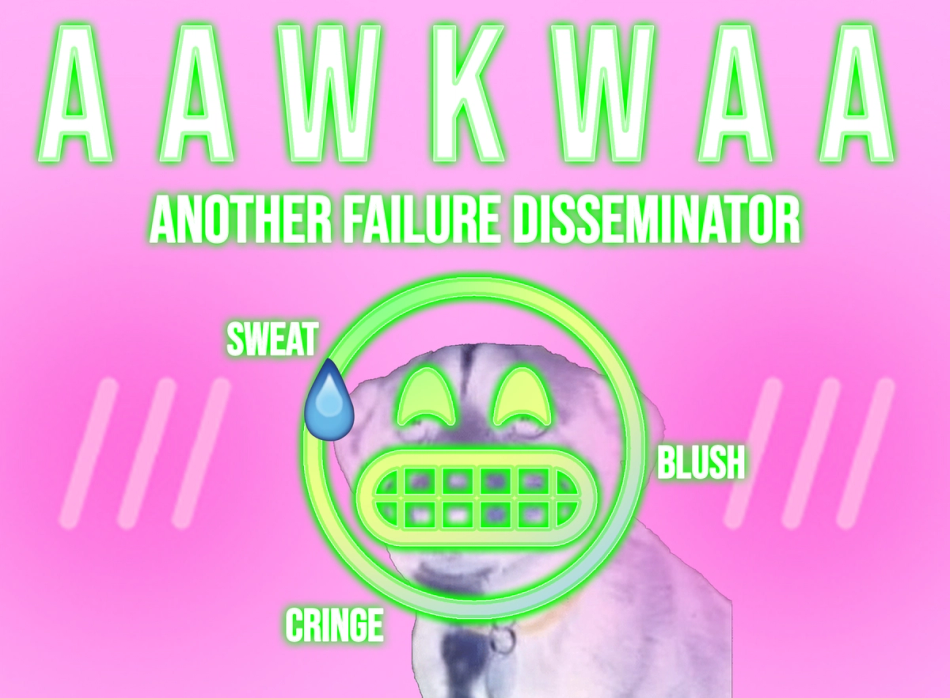 Meet Aawkwaa, your unreliable guide into the real world. Navigate mundane social interactions, cute public exclamations and new disembodied behaviorisms in order to slowly transform yourself into yet another failure. Bleed surrealism into yourself as you play as an awkward agent in a world of cool kids.
