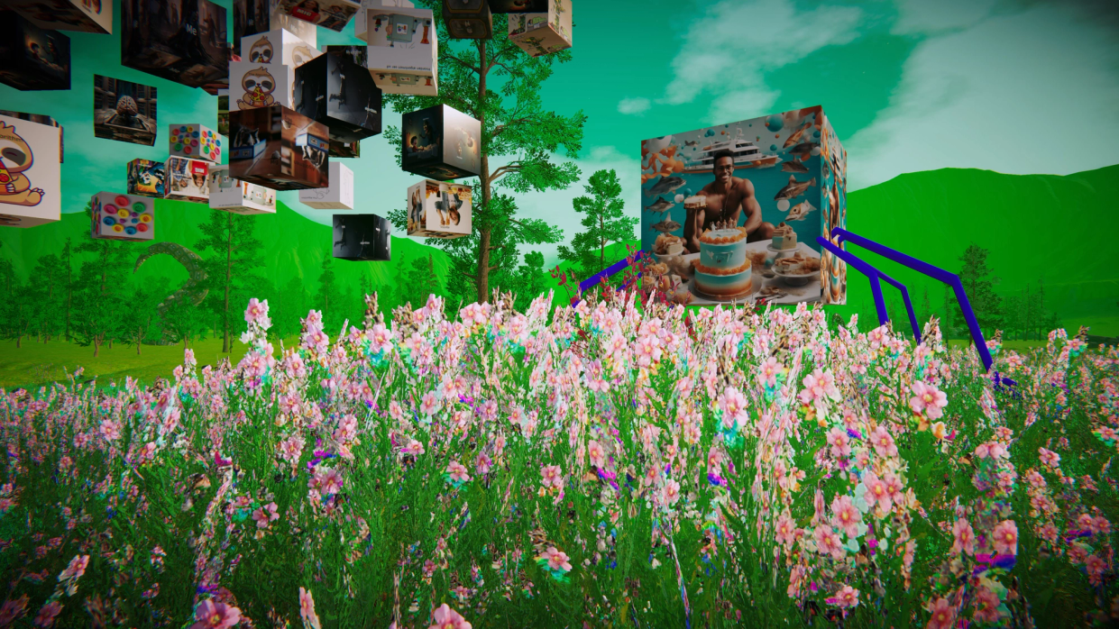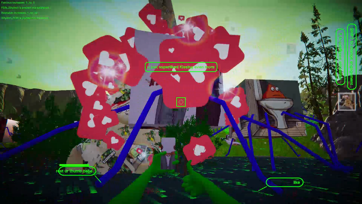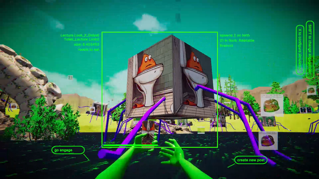 Creators participate in a generative workshop where Game Developer & Artist Esben Holk instructs a qualitative research and analysis of their personal social media feed, to uncover and reproduce the pervasive cultural/memetic/communal icons of their online existence and share them into the simulation.