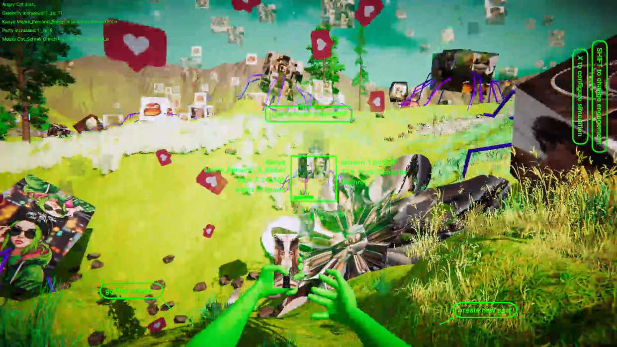 Image Ecology Simulation explores the algorithmic relationship between players/humans, content and technology, by procedurally creating vast rhizomatic media landscape populated with displaced images, memes and other artefacts of remix culture from the collective pool of creators’s online experience. Each image searches for similar images to reproduce with and dissimilar images to consume.